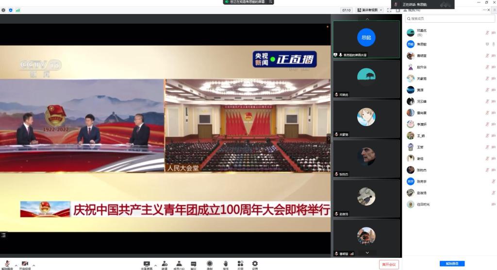 庆祝中国共产主义青年团成立100周年大会于5月10日上午在北京人民大会堂隆重举行,中共中央总书记、国家主席、中央军委主席习近平发表重要讲话。硕士2101党支部联合硕士2101团支部组织党员和团员线上集中收看,会议由党支部宣传委员焦思懿主持。