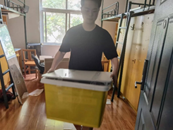 10月9日上午九点,寒露刚过,初秋微凉,从柏景阁回迁南一舍的工作有条不紊地进行着。学校、学院从学生切身利益出发,提前准备编织袋,联系好搬运车辆,女生提前打包行李,男生接力传递包裹,使本次活动达到了搬迁效率高、支部凝聚力强的效果。