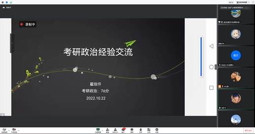 (通讯员 王泽楠 王首越)为帮助学院考研学子合理规划考研安排,稳住备考心态,进一步推进落实“我为群众办实事”活动,学院硕士2207、2208、2209党支部联合本科2019级第二党支部于10月22日晚以线上的方式举办考研指导交流会,邀请考上beat365的22级研究生从考研整体情况分析、专业课和政治考试重点以及备考进度安排等方面进行了全面的指导和交流。本科2019级辅导员王泽楠主持会议。
