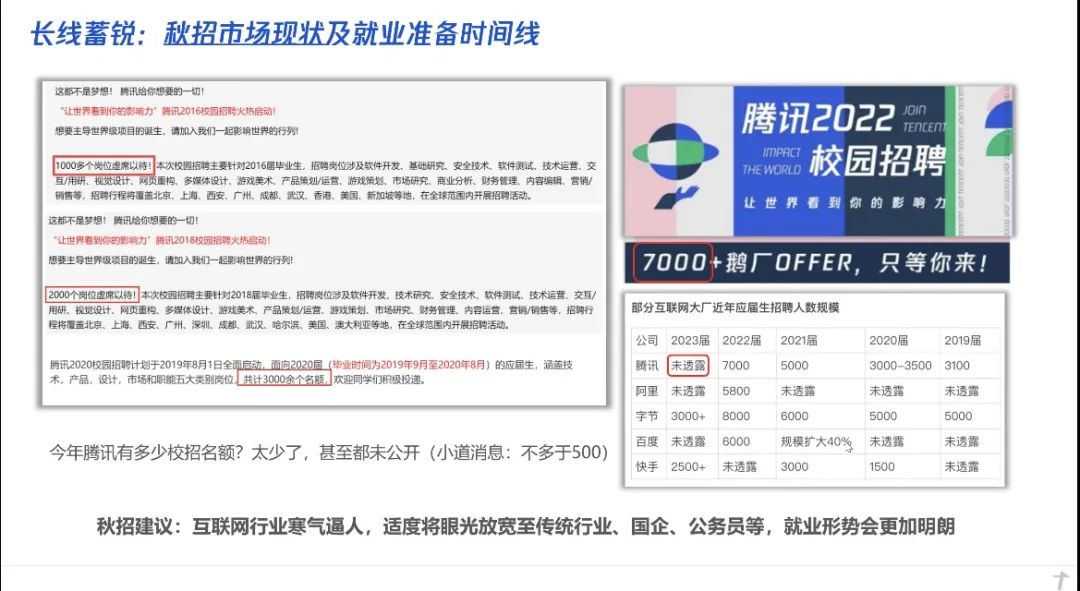 杨宇宁介绍个人情况后,通过长线蓄锐和短线磨枪两方面介绍了秋招市场的现状、分享了就业准备的时间线和通用的面试技巧。帮助同学们减缓学历焦虑和成绩焦虑,建议大家在求职时充分分析现状、做好目标取舍。
