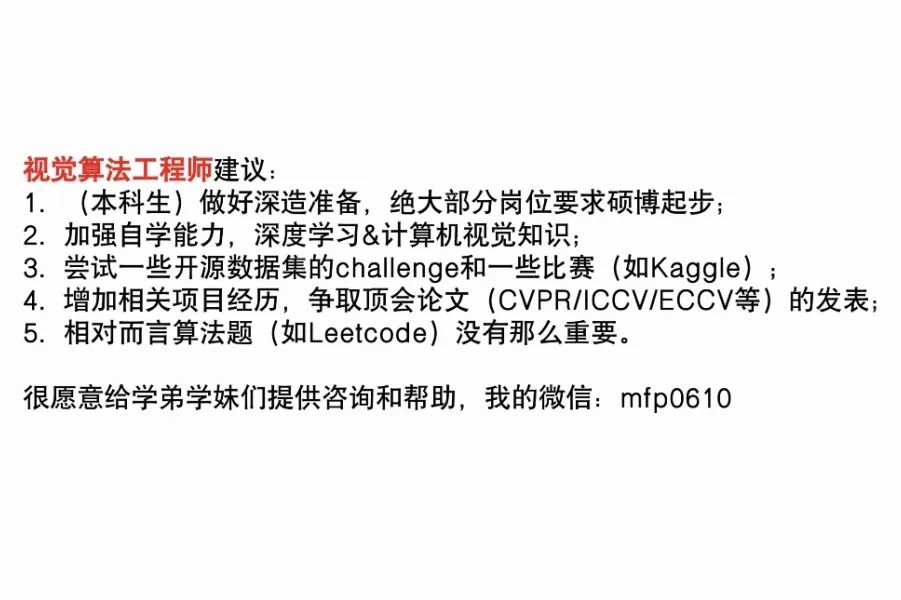 孟繁鹏从个人基本情况、科研经历、实习经历、校园经历等方面出发,分享了自己获得的秋招offer、实习offer。他结合自己的实习、科研经历,针对求职视觉算法工程师的职位提出建议,鼓励同学们锻炼自学能力、积极参加比赛、尝试发表论文等增强求职核心竞争力。