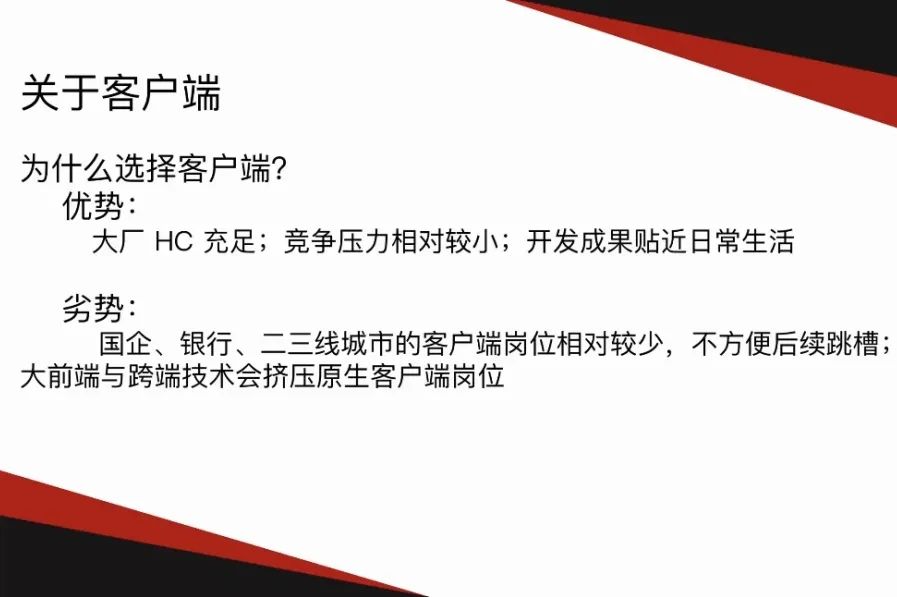 李浩宇着重分享了自己求职思想的转变,强调了大三下学期暑期实习的重要性。根据个人实习经验,分析了客户端岗位的优势与劣势,并简单讲述了如何入门ios,并推荐相关书目,同时分享了客户端岗位方向的笔试、面试的经验以及个人求职体会,最后呼吁同学们学会平衡兴趣与职业的关系。