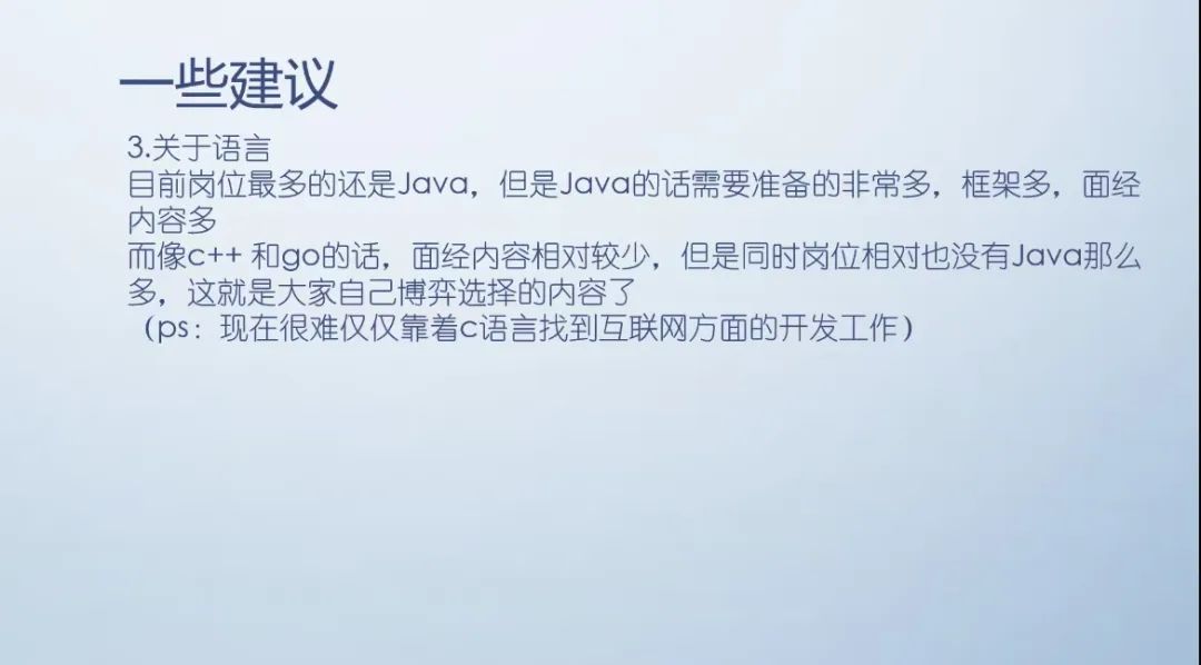 吴优分享了招聘碰壁的经历,他建议同学们尽早明确生涯规划,提前准备实习经历。他还分析了各种编程语言在就业市场中的岗位情况,最后分享了简历制作经验。