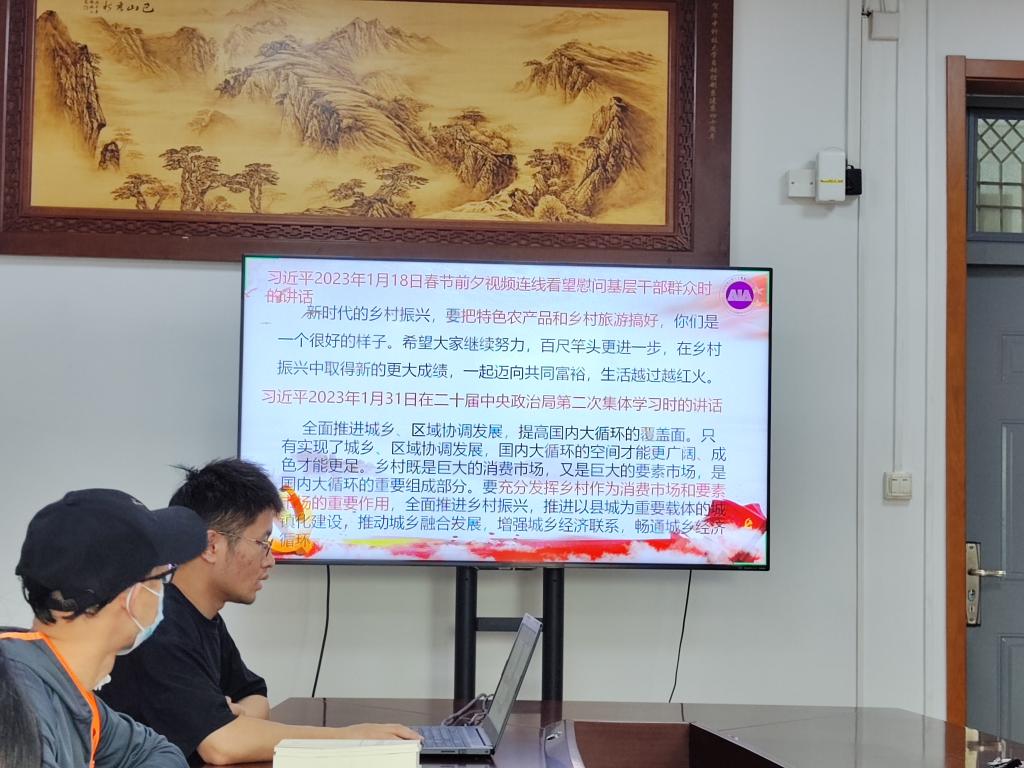 支部党员林宇以习近平论“三农”工作和乡村振兴战略为主题。领学了习近平总书记2023年5月1日给中国农业大学科技小院同学的回信精神,强调了青年要走进乡土中国深处,才能深刻理解什么是实事求是、怎么去联系群众,青年人就要“自找苦吃”。