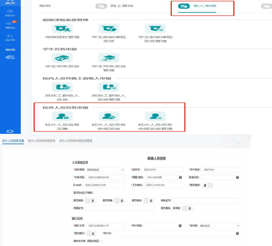 (3)校外人员劳务费发放表(一份原件,二份复印件,需填写 外专护照号、姓名,账号信息。填写地址:财务系统"收入申报"-"校外人员劳务申报")